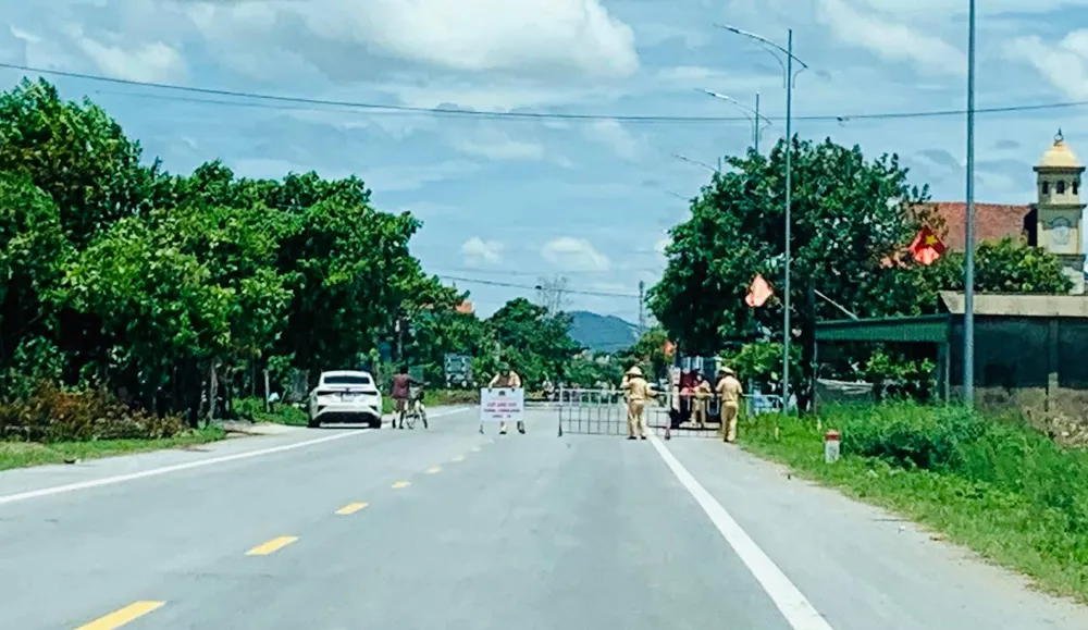 Lực lượng Công an huyện Nghi Xuân (Hà Tĩnh) lập chốt kiểm soát trên đường vào xã Cương Gián vào trưa 14-6.