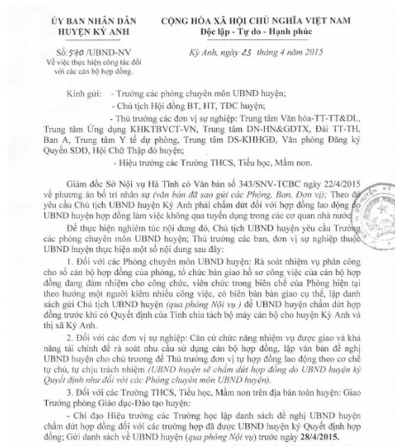 Để thực hiện nghiêm công văn trên, Chủ tịch UBND huyện Kỳ Anh Nguyễn Văn Bổng ký văn bản văn số 570 về việc thực hiện công tác đối với cán bộ hợp đồng. Theo công văn này, giao Trưởng Phòng GD&ĐT huyện Kỳ Anh chỉ đạo hiệu trưởng các trường lập danh sách đề nghị UBND huyện Kỳ Anh chấm dứt hợp đồng đối với các trường hợp đã được UBND huyện ký quyết định hợp đồng, gửi danh sách về huyện trước ngày 28-4.