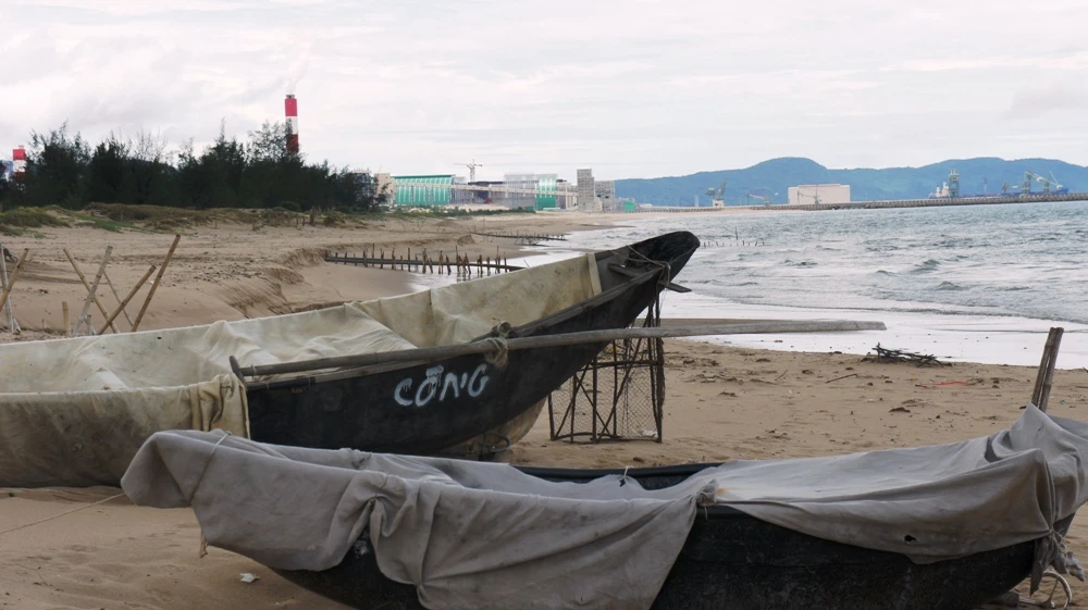 Những con thuyền đang gác mái chèo, nằm bờ ở phía Nam Công ty Formosa Hà Tĩnh.
