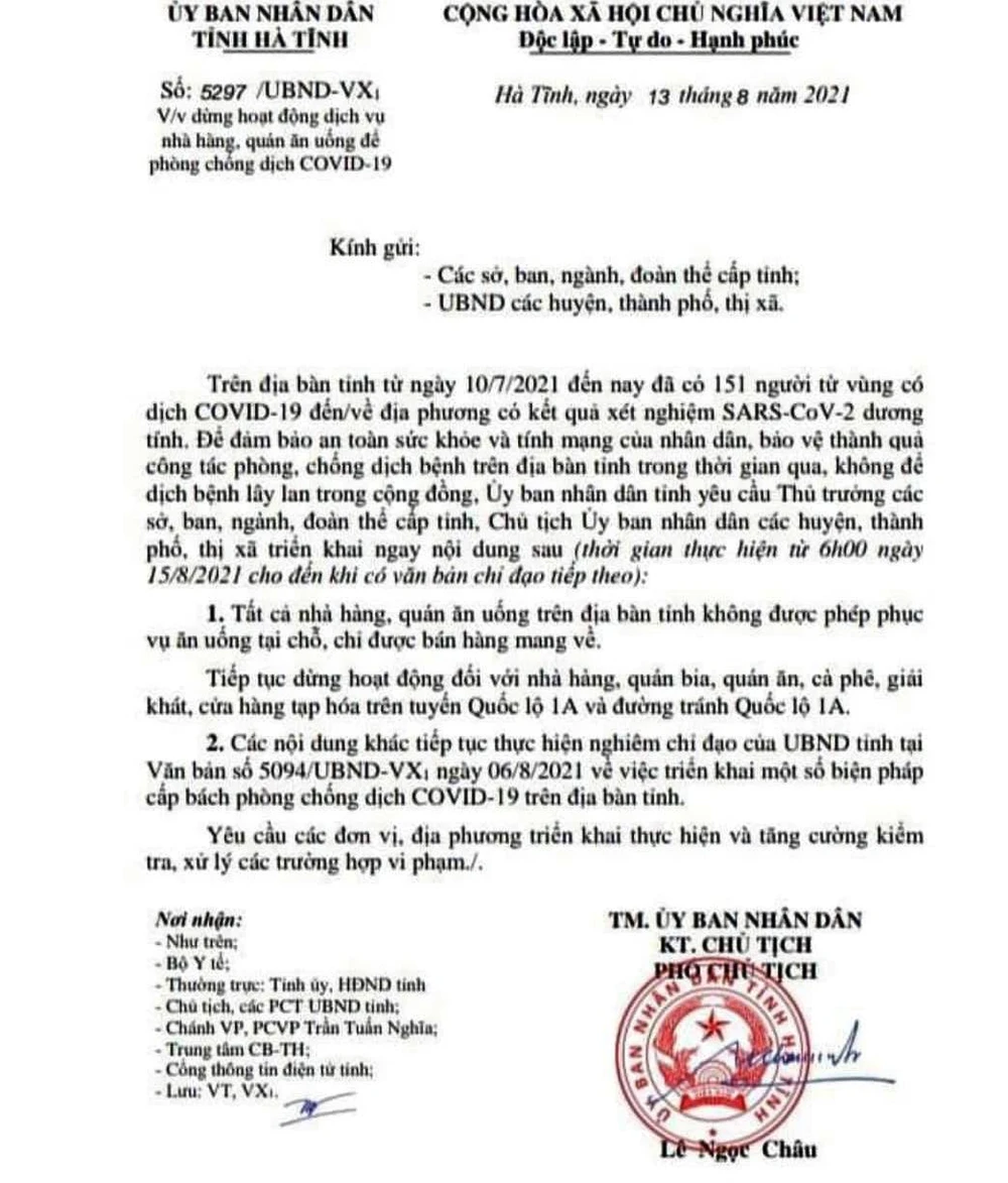 UBND tỉnh Hà Tĩnh yêu cầu từ 6 giờ sáng 15-8, tất cả các nhà hành, quán ăn uống trên địa bàn tỉnh Hà Tĩnh không được phép phục vụ ăn uống tại chỗ, chỉ được bán hàng mang về.