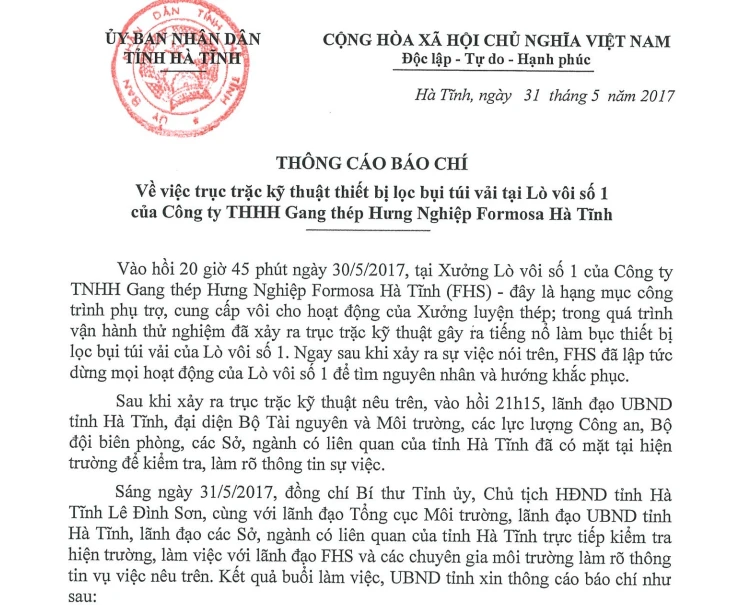 Chiều nay (31-5), UBND tỉnh Hà Tĩnh đã thông cáo báo chí về sự việc vụ nổ tại xưởng lò vôi số 1 của Công ty TNHH Gang thép Hưng Nghiệp Formosa Hà Tĩnh (thị xã Kỳ Anh, Hà Tĩnh) vào hồi 20 giờ 45 phút ngày 30-5.