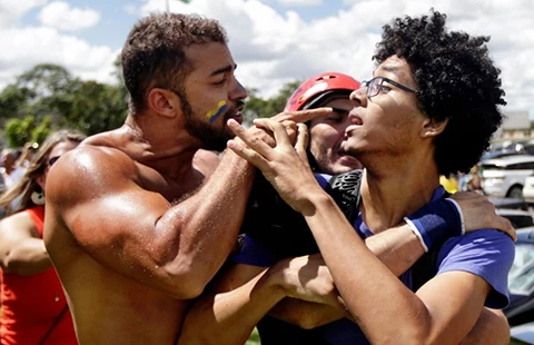 Phe chống đối và phe ủng hộ Tổng thống Dilma Rousseff dọa nhau trong biểu tình ngày 17-3 ở Brasilia. Ảnh: REUTERS