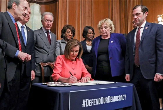 Đại diện Hạ viện gửi điều khoản luận tội chống lại Tổng thống Donald Trump lên Thượng viện Mỹ hôm 15-1. Ảnh: AFP