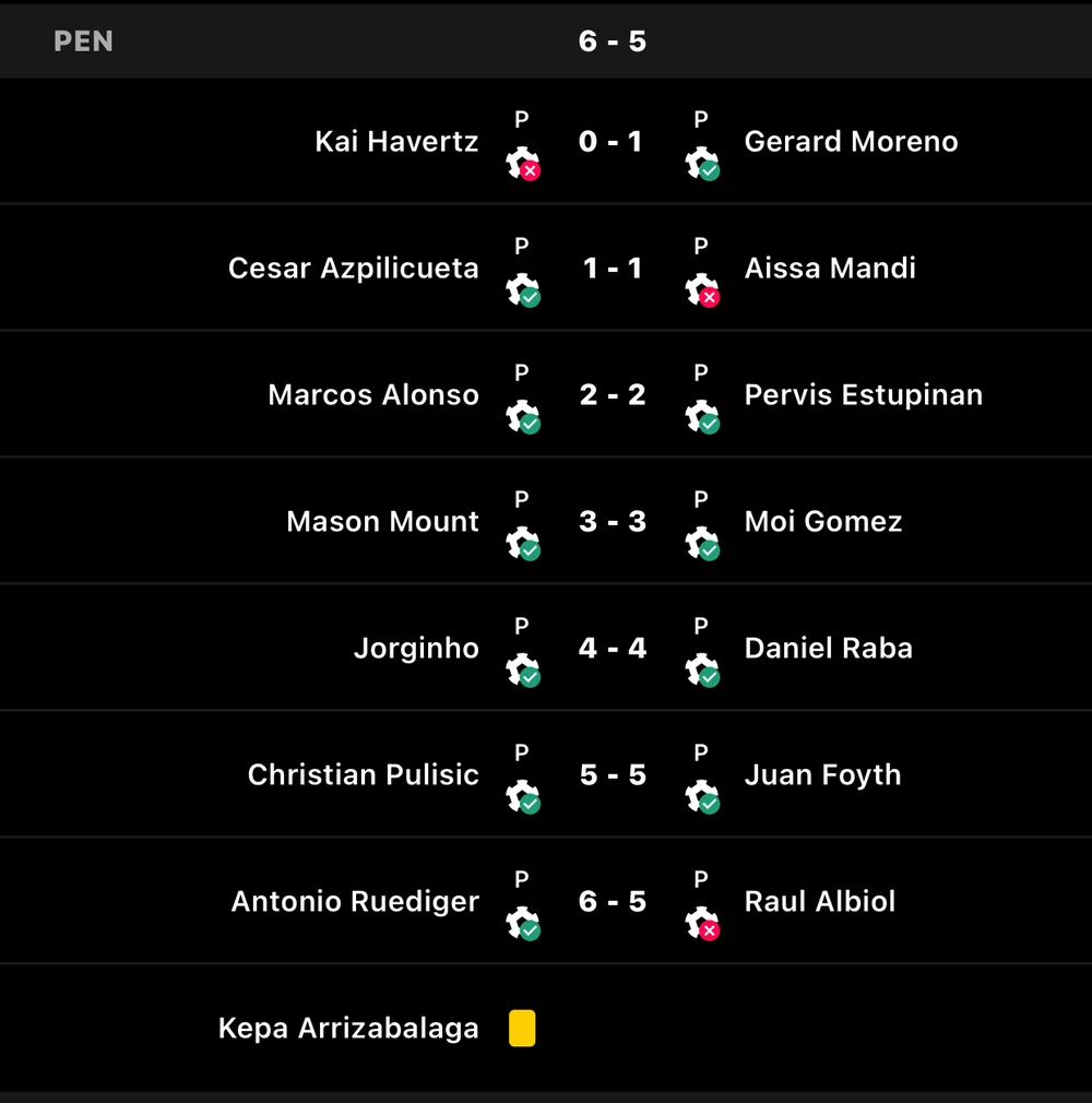 Trên loạt “đấu súng”, Chelsea sớm gặp bất lợi khi Kai Havertz sút hỏng ở loạt sút đầu tiên. Nhưng sau đó, thế trận cũng được cân bằng khi Aissa Mandi bên phía Villarreal sút hỏng ở loạt đá thứ hai. Phải đến lượt sút thứ 7, Chelsea mới có thể lên ngôi vô địch khi thủ môn Kepa cản phá thành công cú sút của đội trưởng Raul Albiol bên phía Villarreal. Đánh bại “Tàu Ngầm Vàng” với tỷ số 6-5 ở loạt “đấu súng”, Chelsea lên ngôi vô địch siêu cúp châu Âu.