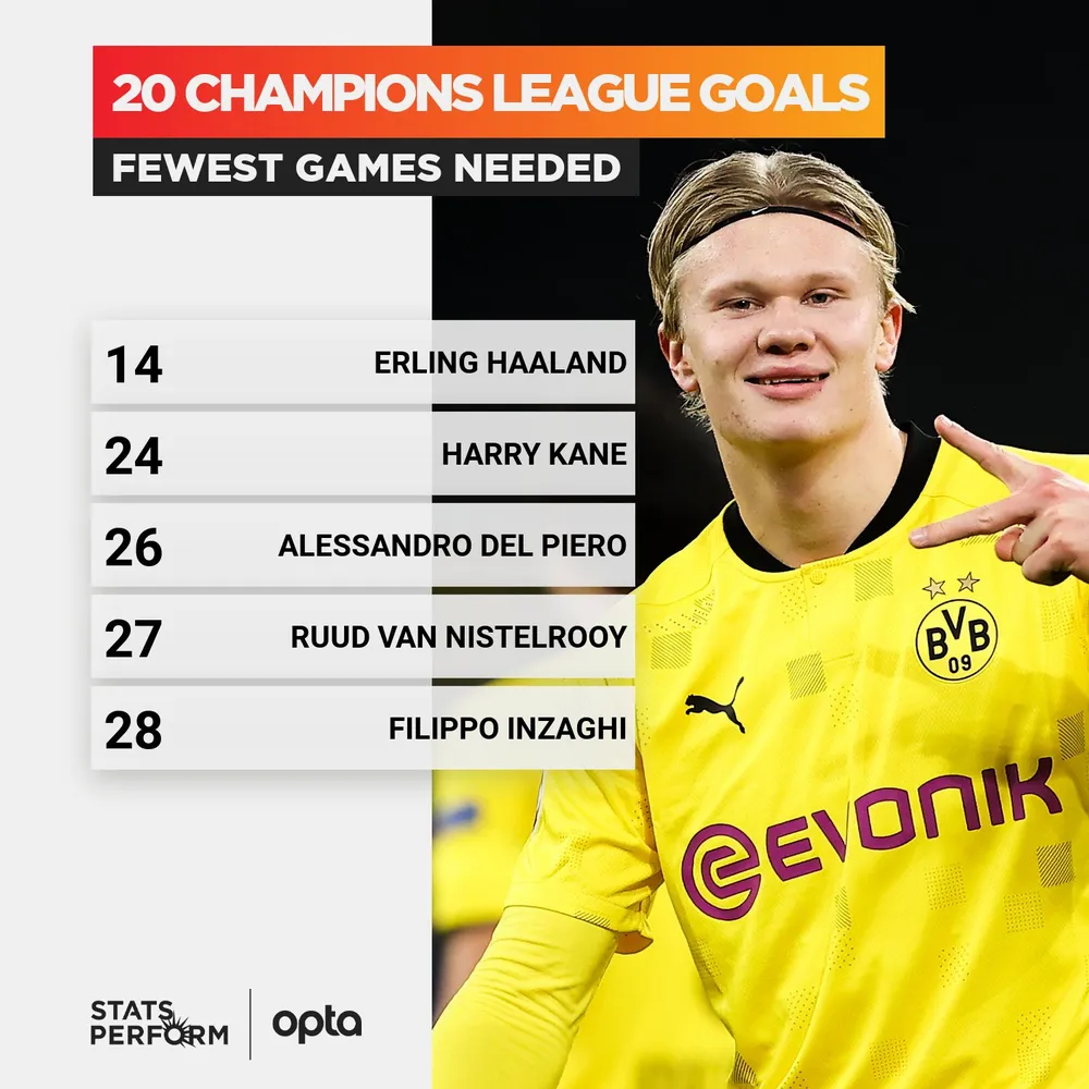 Trong Top 5 cầu thủ ghi 20 bàn thắng nhanh nhất lịch sử Champions League, ngoài Haaland và Kane còn có Del Piero (26 trận), Ruud Van Nistelrooy (27 trận) và Filippo Inzaghi (28 trận).