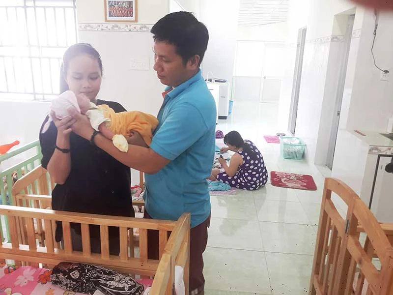 Cha Nguyễn Văn Lâm (trên) trò chuyện cùng bé và cha Nguyễn Văn Phúc hướng dẫn cho một bảo mẫu cách bế trẻ sơ sinh. Ảnh: NGUYỄN QUYÊN