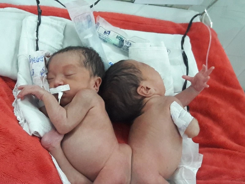 Sản phụ Quyền chuyển dạ từ ngày 22-7, nhập viện Đa khoa Lộc Ninh, Bình Phước khi được 33 tuần. Đến ngày 23-7, sản phụ này được các bác sĩ BV Đa khoa Lộc Ninh mổ lấy con thành công. Hai bé chào đời nặng 3,4 kg, tuy nhiên lại dính liền mông với nhau, sức khỏe yếu, được các bác sĩ cho hồi sức và chuyển vào BV Nhi đồng 2 điều trị trong ngày.
