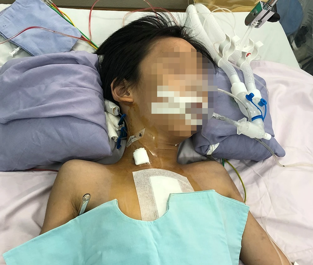 Đến khoảng 10 giờ 15 phút, xe chuyển bệnh nhi đến và được đưa thẳng vào phòng mổ. Tình trạng bé A. hết sức nguy kịch, tiên lượng gần như tử vong do tím tái, lơ mơ, sốt cao, tim, mạch rất yếu, huyết áp tụt. Ngực bé bị vật nhọn đâm trúng nhưng vật nhọn đã bị rút ra khiến máu chảy ồ ạt.