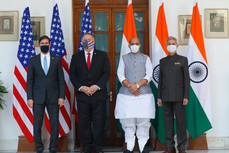 Lần lượt từ trái sang: Bộ trưởng Quốc phòng Mark Esper, Ngoại trưởng Mỹ Mike Pompeo, Bộ trưởng Quốc phòng Ấn Độ Rajnath Singh và Ngoại trưởng Subrahmanyam Jaishankar ở New Delhi, ngày 27-10. Ảnh: AP