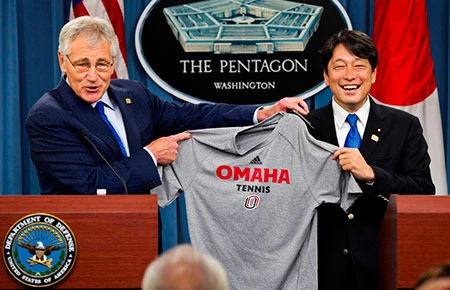 Bộ trưởng Quốc phòng Chuck Hagel (trái) tặng người đồng cấp Itsunori Onodera áo thi đấu của đội tuyển quần vợt ĐH Nebraska Omaha (nơi ông Chuck Hagel từng theo học) tại cuộc họp báo chung ở Lầu Năm Góc hôm 11-7. Ảnh: BỘ QUỐC PHÒNG MỸ