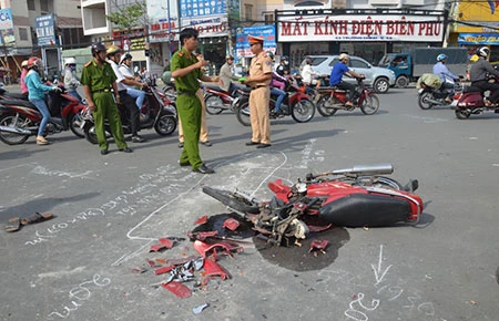 Tại hiện trường, xe máy bị cán nát vụn, hư hỏng hoàn toàn. Lực lượng CSGT - Công an quận 12 có mặt lập biên bản xử lý.