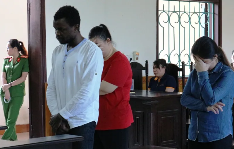 Bị cáo Sylvester Zazy Nlemonwu, Đinh Thị Thu Thủy, Lê Thị Mai Trâm tại phiên tòa sơ thẩm.