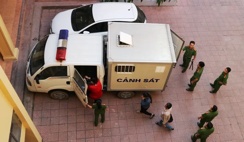 Xe cảnh sát chở bị cáo Trâm, Thủy về trại tạm giam.