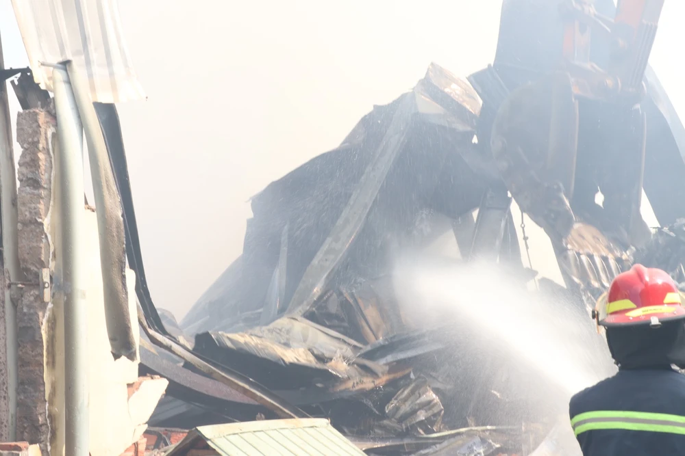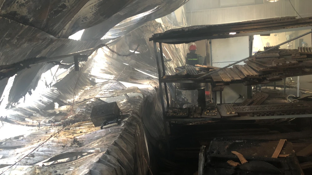 Ngọn lửa được dập tắt nhưng khu nhà xưởng rộng hàng ngàn mét vuông bị đổ sập hoàn toàn. Ảnh: KD