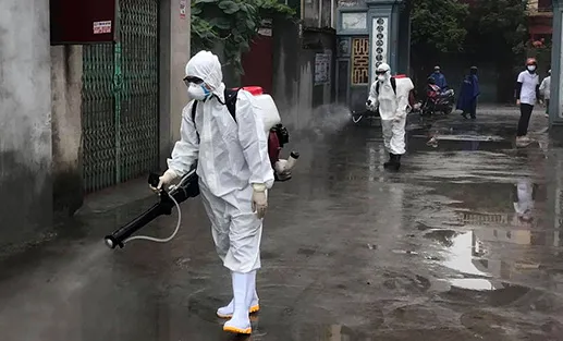 Cơ quan chức năng phun tiêu độc khử trùng tại thôn Tiêu Sơn, nơi có cháu bé nhiễm COVID-19.