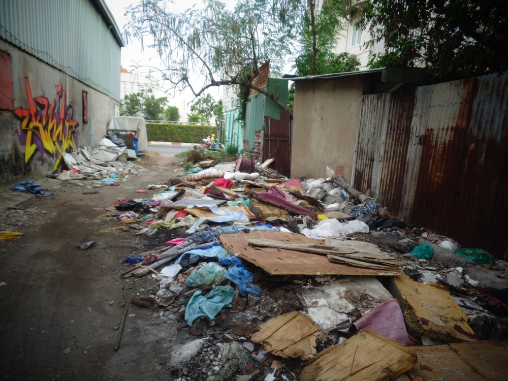 Cũng trên địa bàn TP Thủ Đức, trên đường Phạm Văn Đồng, đoạn ngay cầu Bình Lợi, phường Hiệp Bình Phước có khu đất trống chất đầy rác, nhếch nhác cả dưới đất lẫn trên tường.