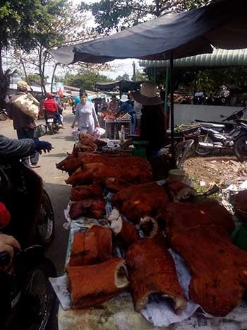 Heo được quay chín vàng, để nguyên con hoặc xẻ thành từng miếng phơi trên những chiếc bàn gỗ cáu bẩn, nứt nẻ nằm bên đường. Nắng, gió cứ vô tư hắt bụi vào. Có những bàn đặt cạnh đống rác bốc mùi nồng nặc, ruồi bu kín. Vậy mà việc mua bán vẫn diễn ra hết sức tấp nập. Điều đáng ngạc nhiên nhất là hiện trên thị trường giá thịt heo quay dao động từ 220.000 đến 240.000 đồng/kg thì ở đây thịt heo quay được gọi là “lộc sơn thần” lại được bán giá rẻ như bèo.