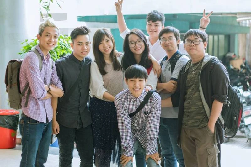 Dũng (hàng đầu tiên) và những giờ phút thoải mái bên bạn bè.