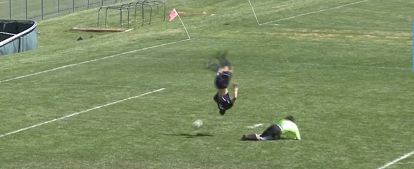 Sau khi nhận đường chuyền dài của đồng đội, Dylan Prichett-Ettner bứt tốc chạy theo bóng, thủ môn đội ThunderRidge đã kịp lao ra cản bóng, sẵn đà lao tới không thể hãm lại, Dylan Prichett-Ettner buộc phải thực hiện cú nhào lộn Santo vượt qua đầu thủ thành đối phương để tránh va chạm.