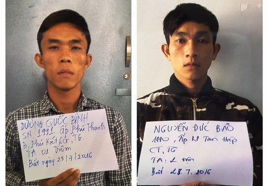 Hai đối tượng gồm Dương Quốc Bình (25 tuổi, ngụ huyện Chợ Gạo) và Nguyễn Đức Bảo (36 tuổi, ngụ Châu Thành, Tiền Giang) đều đã từng có tiền án về tội trộm cắp.