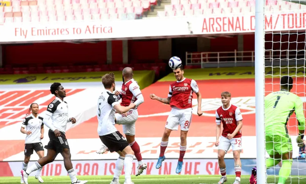 Pha đánh đầu của Ceballos và bàn phản lưới nhà của hậu vệ bên phía Fulham không đem về bàn thắng cho Arsenal. Ảnh: PA.