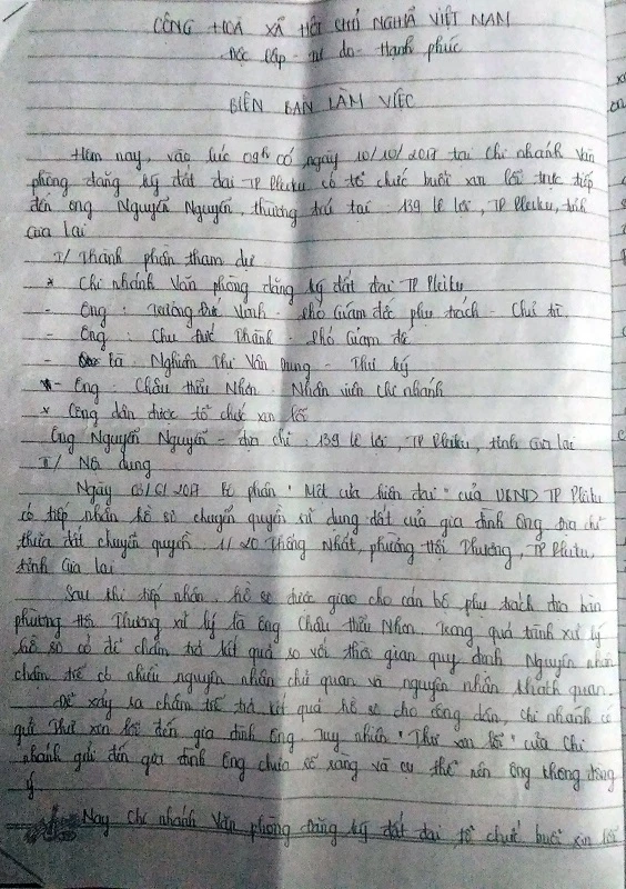 Trước đó, ngày 3-6, bộ phận “Một cửa hiện đại” của UBND TP Pleiku có tiếp nhận hồ sơ chuyển quyền sử dụng đất của gia đình ông Nguyễn.