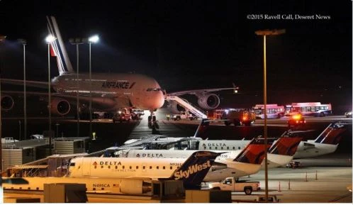 Chuyến bay số hiệu AF65 cũng đã hạ cánh an toàn tại TP Salt Lake khoảng 19 giờ 30 (giờ địa phương). Hơn 400 hành khách đã được sơ tán khỏi máy bay ở Salt Lake, bang Utah. Cảnh sát hiện đang kiểm tra máy bay.