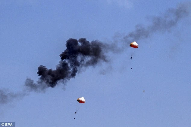 Cảnh phim cho thấy bốn phi công phóng khỏi các chiếc phi cơ gặp nạn trước khi chúng bốc cháy (Ảnh: Dailymail)