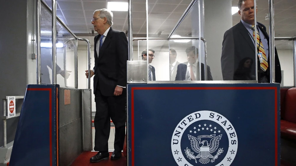 Lãnh đạo đa số tại Thượng viện (do đảng Cộng hòa kiểm soát), ông Mitch McConnell đã rời tòa nhà Quốc hội trước cuộc bỏ phiếu về dự luật phản ứng với COVID-19 hôm 18-3. Ảnh: AP