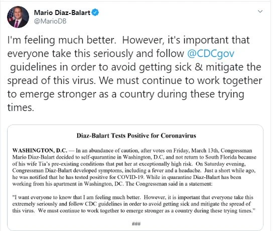 "Sau cuộc bỏ phiếu về dự luật phản ứng với COVID-19 hôm 13-3, Nghị sĩ Mario Diaz-Balart đã quyết định tự cách ly tại thủ đô Washington mà không quay về quê nhà South Florida sau khi vợ ông - bà Tia Diaz Balart có một số dấu hiệu bệnh" - thông báo từ văn phòng ông Diaz-Balart ngày 18-3 cho biết.