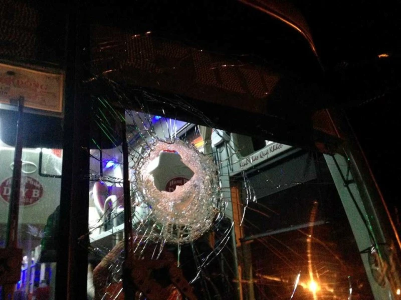 Cú ném đá gây ra tiếng nổ và làm bể vụn tấm kính trước của xe. Chưa dừng ở đó, khi chiếc xe này dừng lại bên đường để xử lý sự cố thì hai thanh niên vòng xe lại, ném đá thêm lần nữa vào bên hông xe khách.