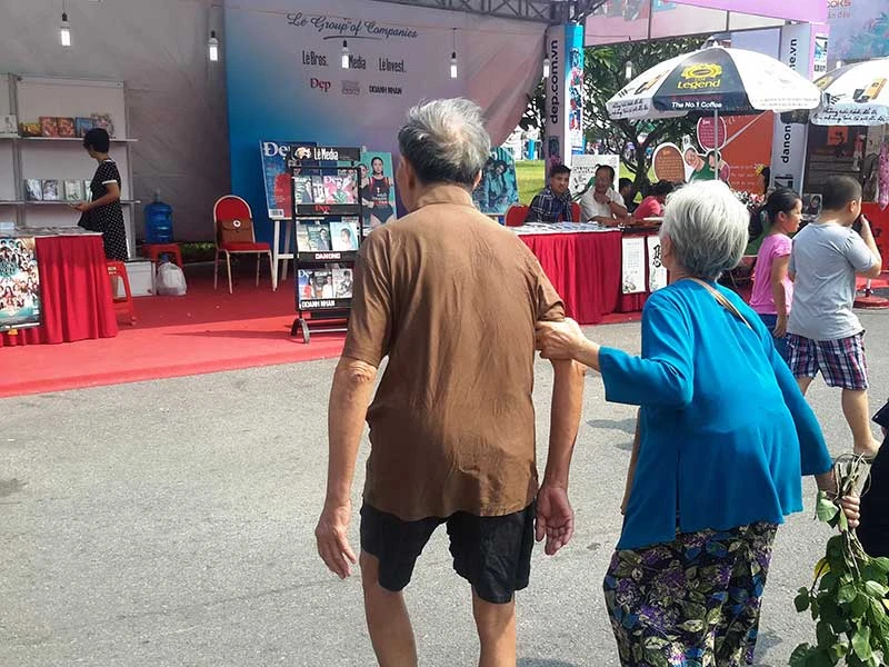 Cô thu ngân đang uể oải đưa những cuốn sách lên quét mã vạch tính tiền, cậu sinh viên đang lau mồ hôi giữa dòng người chờ đợi đến lượt thanh toán kéo dài dằng dặc. Bỗng nhiên, ánh mắt tất cả đều hướng về phía cổng hội sách. Ở đó có hai người già đang chầm chậm bước vào phía trong. Ông quần đùi, lưng còng. Bà lưng còng, tay cầm một cành hoa chắc vừa hái vội ở đâu đó, nắm chặt lấy tay ông(ảnh).