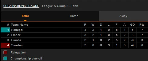 Với kết quả hòa 0-0, Pháp và Bồ Đào Nha có cùng 7 điểm ở bảng 3 Nations League A nhưng Bồ Đào Nha đứng đầu bảng nhờ hơn hiệu số (+5 so với +3).