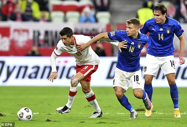 Lewandowski đi bóng trước sự đeo bám của Barella trong trận Ý hòa Ba Lan 0-0.