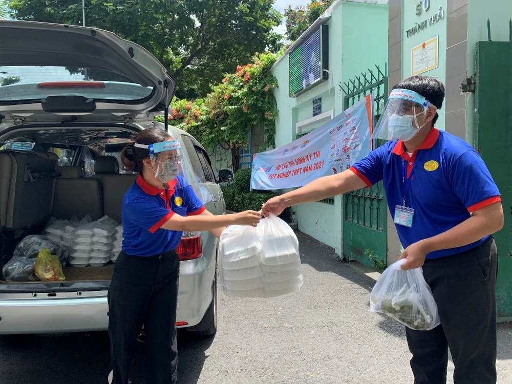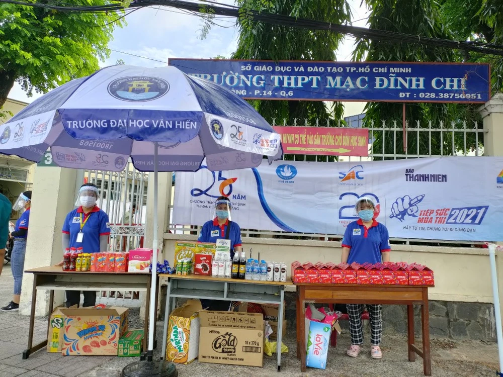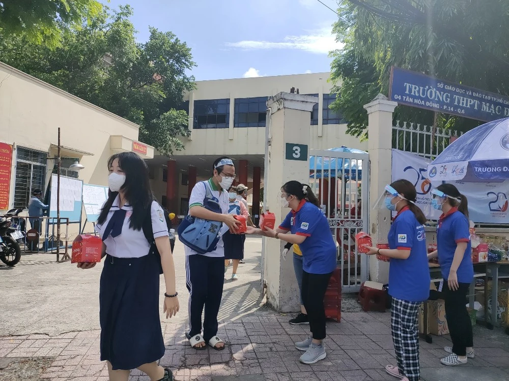 Sinh viên TSMT tại điểm thi THPT Mạc Đĩnh Chi (quận 6) đang phát quà cho thí sinh. Ảnh: THẢO PHƯƠNG
