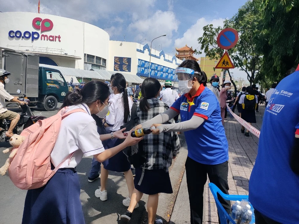 Sinh viên TSMT tại điểm thi THPT Mạc Đĩnh Chi (Q6) đang phát nước uống cho thí sinh. Ảnh: THẢO PHƯƠNG