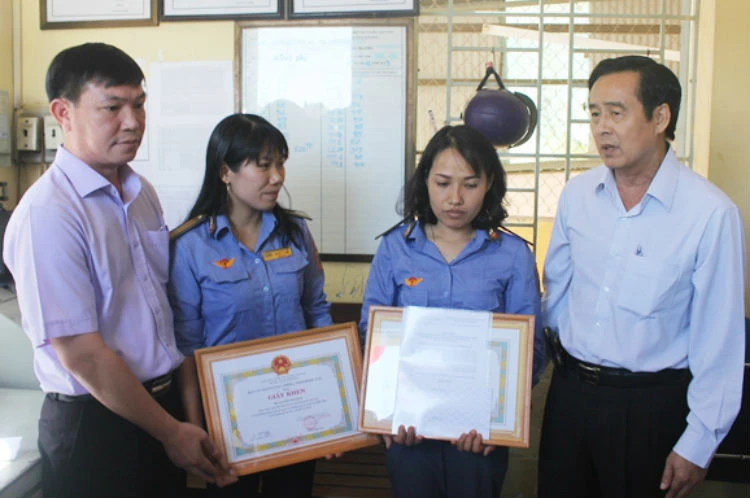 Phía tỉnh Đồng Nai, ông Trịnh Tuấn Liêm, Giám đốc Sở GTVT Đồng Nai, trao giấy khen cùng số tiền mỗi người 1 triệu đồng của Ban ATGT tỉnh để biểu dương hai nữ nhân viên.