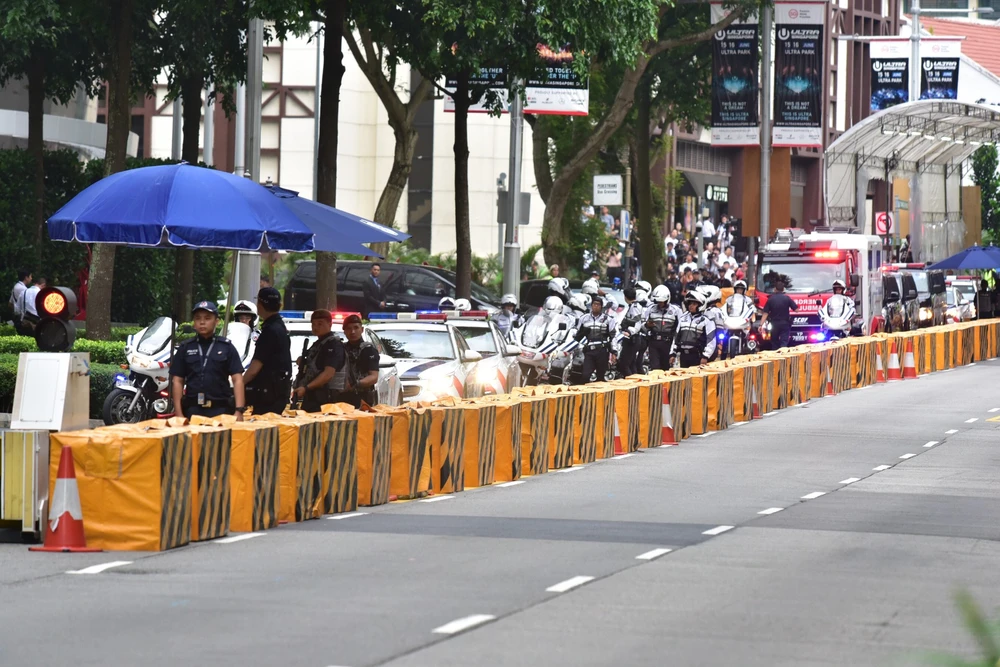 Đoàn xe chở Tổng thống Mỹ Doanld Trump trên đường tiến về khách sạn Capella, nơi tổ chức thượng đỉnh Mỹ-Triều, sáng 12-6. Ảnh: CNA
