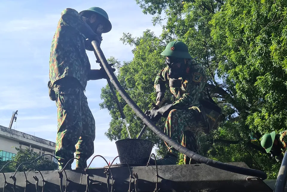 Hoá chất được dùng khử trùng các tuyến đường phố là cloramin B25%, Clorine 70% clo hoạt tính. Lực lượng chức năng sử dụng 4 vòi phun trên xe ô tô để phun hoá chất, đồng thời sử dụng 3 xe tiêu tẩy, 1 xe chở nước của Công ty TNHH MTV môi trường đô thị.