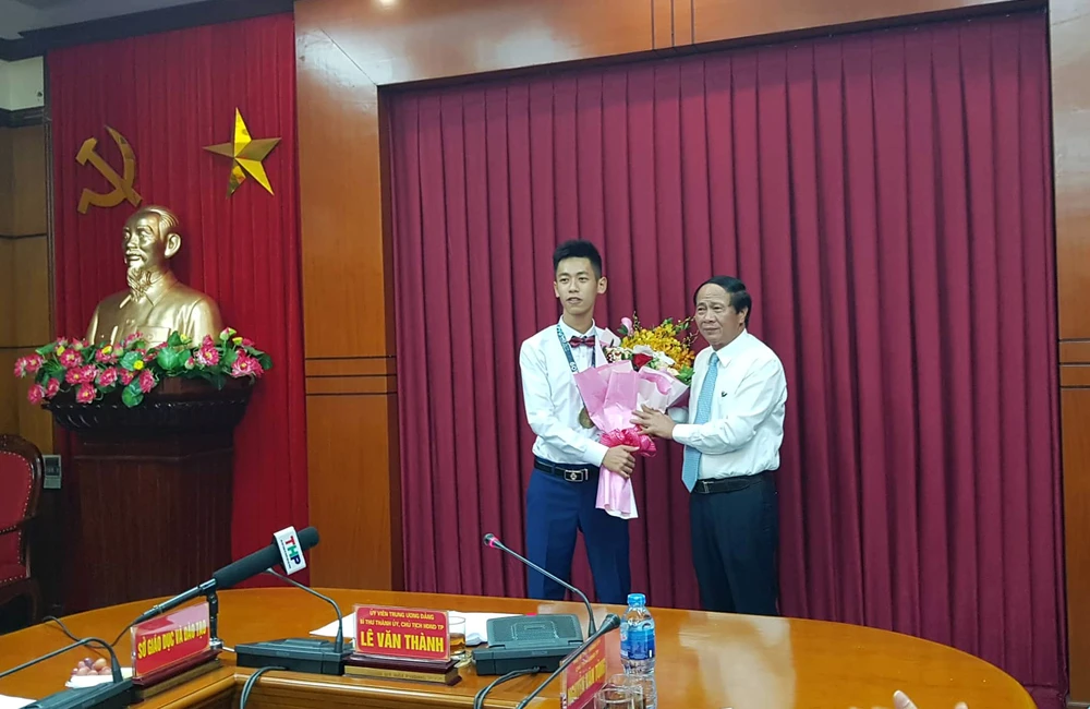 Bí thư Thành ủy Hải Phòng tặng hoa cho học sinh của TP đạt giải vàng Olympic toán quốc tế.