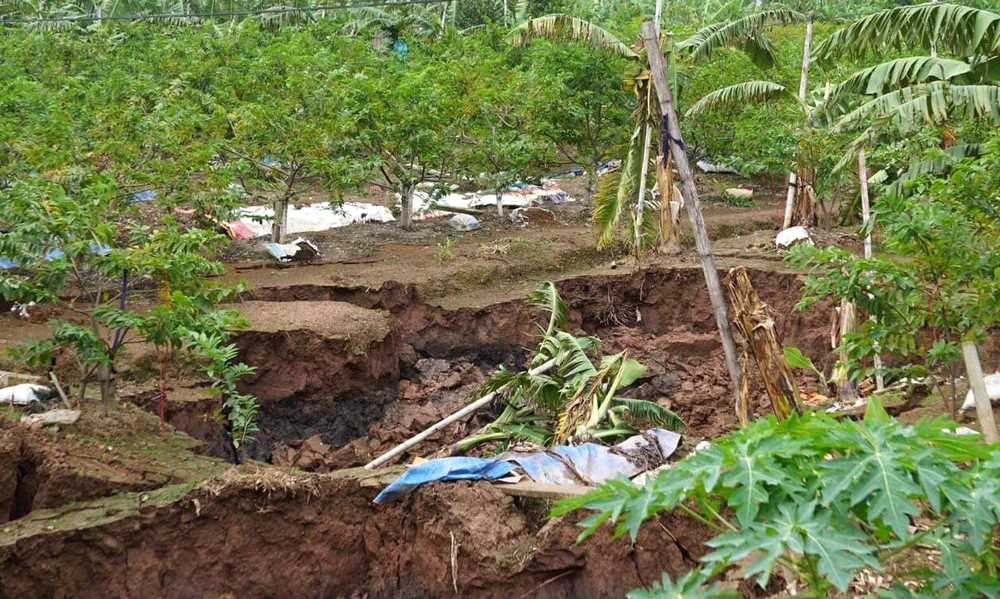 Trước đó, chiều 28-10, người dân phát hiện tại cánh đồng thôn 9 xã An Sơn xuất hiện sự cố sụt lún, sạt lở đất.