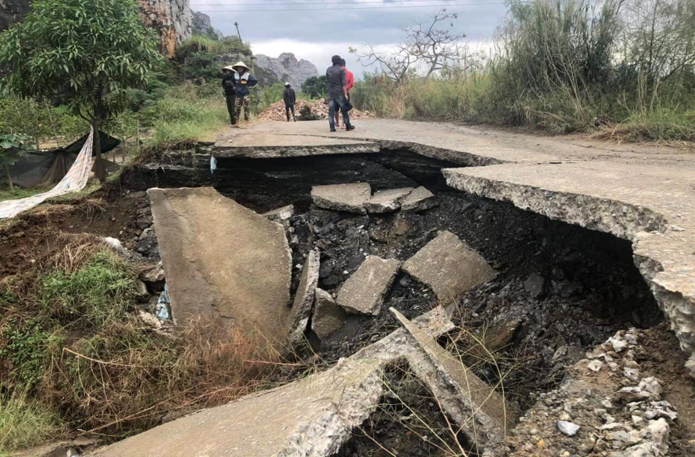 Lực lượng chức năng đã căng dây cảnh báo khu vực nguy hiểm, đồng thời cho đổ đất đá chặn 2 cầu đường đoạn đường bê tông liên thôn bị sụt lún.