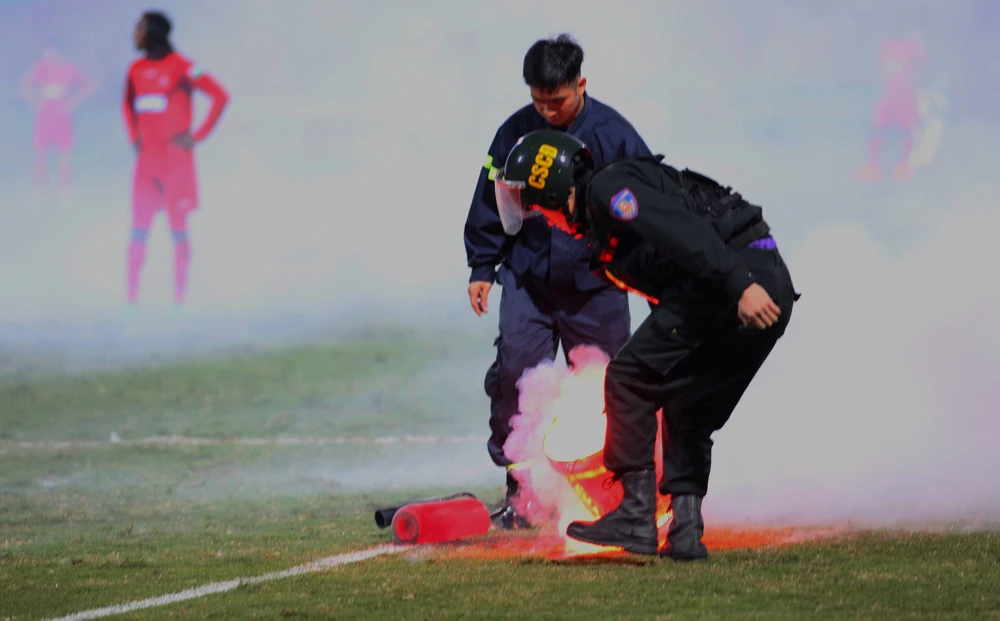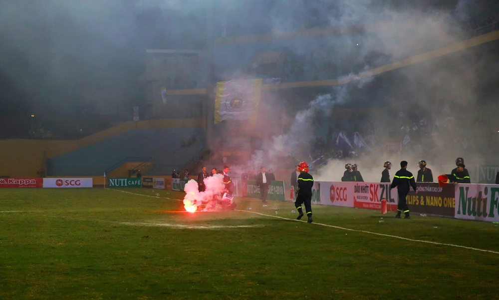 Những phút cuối trận không chỉ trên khán đài pháo sáng được đốt tưng bừng mà hàng chục quả pháo được ném xuống mặt sân thi đấu gây cháy không nhỏ, lực lượng chức năng dùng bình chữa cháy dập.