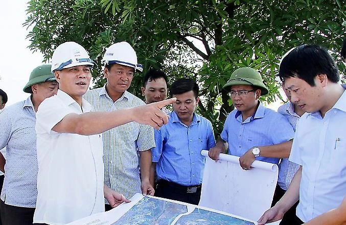 Ông Nguyễn Văn Tùng, Chủ tịch UBND TP Hải Phòng (bìa trái), kiểm tra tiến độ tuyến đường Bắc Sơn - Nam Hải đã yêu cầu chủ đầu tư "trảm" nhà thầu. Ảnh: CTV