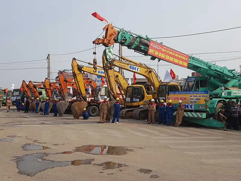 Các phương tiện của nhà thầu được huy động tối đa ngay sau lễ khởi công. Ảnh: Sở GTVT TP Hải Phòng cung cấp