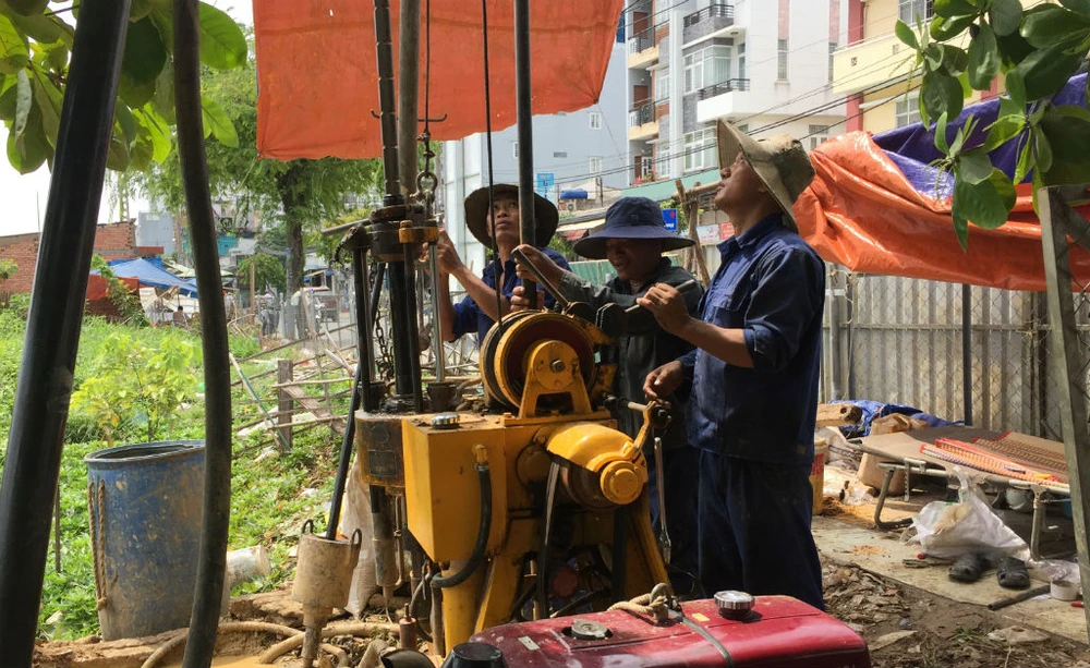 Sáng 17-5, công nhân tiến hành khoan thăm dò địa chất khu vực cầu Nguyễn Khoái phía đường Trần Xuân Soạn, quận 7.