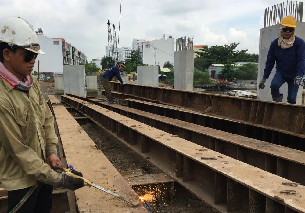 Hiện công nhân đang triển khai lắp hệ đà giáo để chuẩn bị cho việc đúc các nhịp dầm hộp nối sang phía bên kia là khu dân cư cao cấp Him Lam.