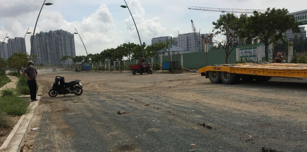 Đến nay toàn bộ mặt đường rộng 20 m và vỉa hè của tuyến đường D1 đã xong, tạo điều kiện cho các trường ĐH mở cửa ra hướng bờ rạch Ông Lớn. Trong ảnh: Xe chở vật liệu xây dựng tấp nập ra vào cửa sau ở khu 13 ha của Trường ĐH Tôn Đức Thắng. Khi con đường chính thức hoàn thành, các trường ĐH trên "bỗng dưng" có hai mặt tiền Nguyễn Hữu Thọ-D1 và Nguyễn Văn Linh-D1.
