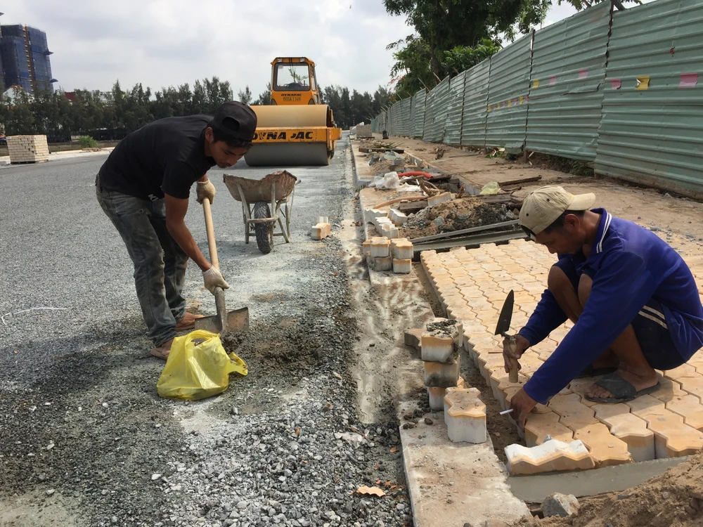 Công nhân hoàn thiện phần vỉa hè đường D1 phía cổng sau của Trường ĐH RMIT.