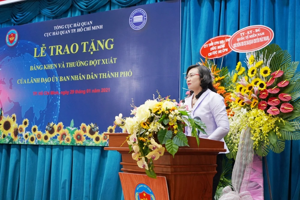 Bà Phan Thị Thắng, Phó chủ tịch UBND TP.HCM tuyên dương chiến công của Cục hải quan TP.HCM trên mặt trật đấu tranh chống ma túy. Ảnh: QH